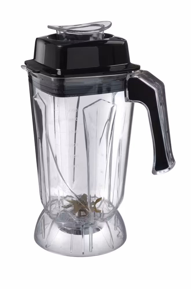 Pichet de 2,5 L en polycarbonate résistant aux chocs, couvercle solide en PET et un bouchon en polycarbonate Le pichet est équipé avec des couteaux en inox avec revêtement en titane.