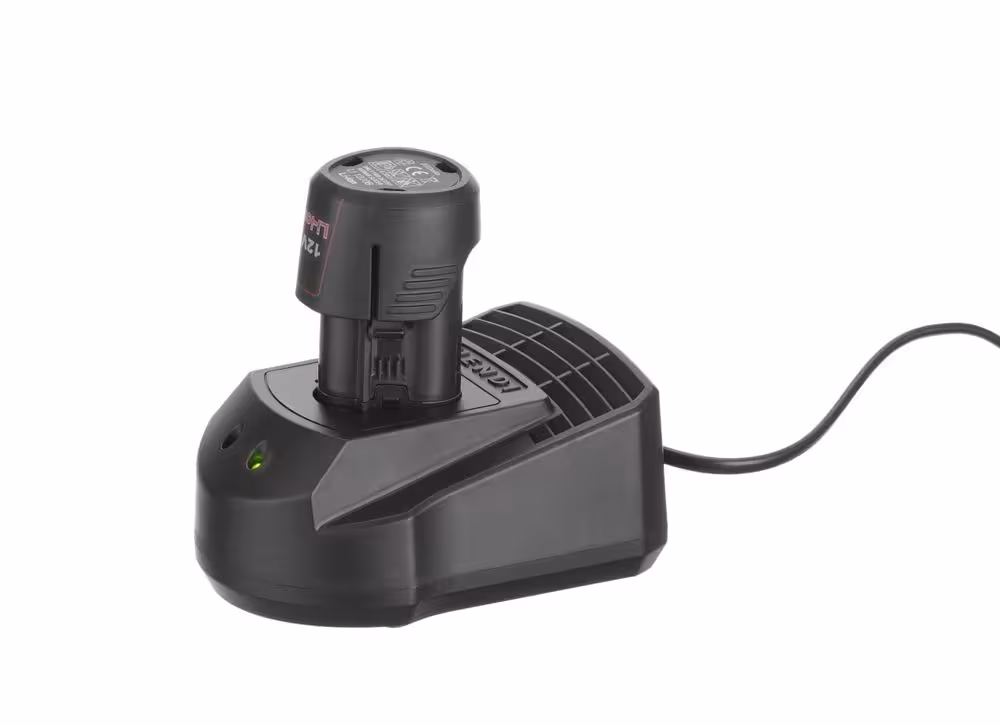 Chargeur avec voyants lumineux (rouge et vert) indiquant le niveau de batterie.