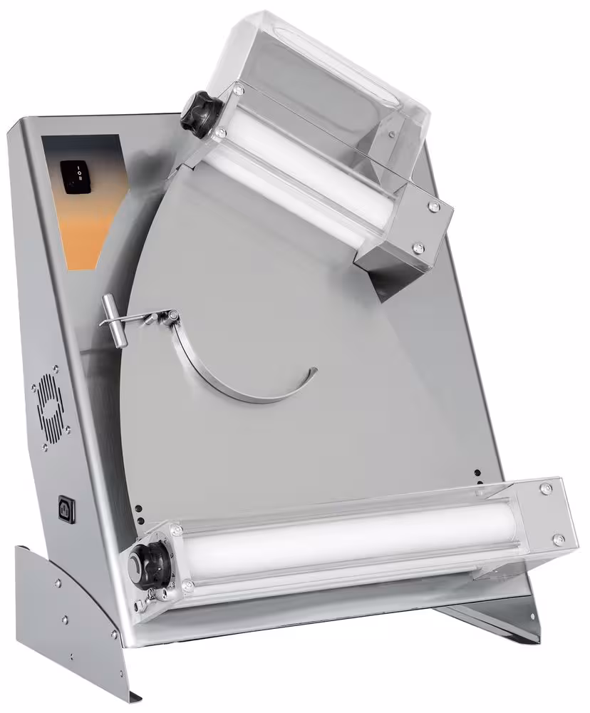 2 groupes de rouleaux ajustables permettent de former la pâte dans un disque rond avec une épaisseur constante.