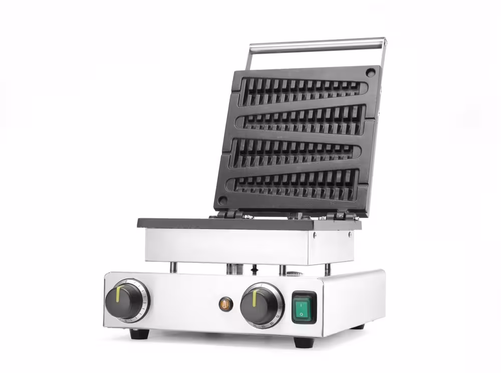 Il est possible de cuire 4 gaufres sucettes en même temps, chacune mesurant 255 mm de long (sans le bâton) et ayant la forme d’un cône allongé.