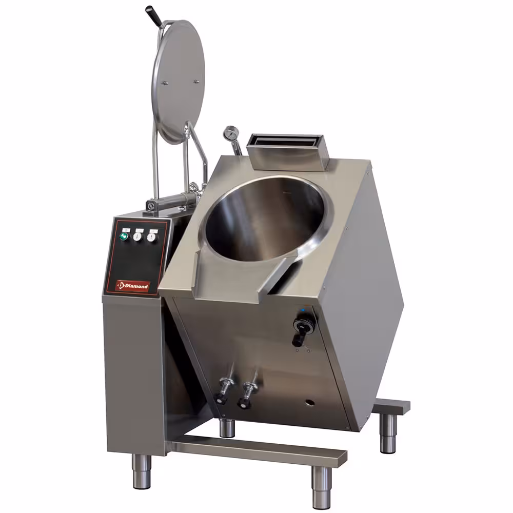 Chauffage indirect, cuve à double enveloppe réalisée en acier inox 304 remplissage par le groupe de sécurité et robinets de contrôle de niveau minimum/maximum de la double enveloppe. Contrôle de la pression de la double enveloppe par une soupape à 0,45 bar, avec manomètre, et soupape de dépression.