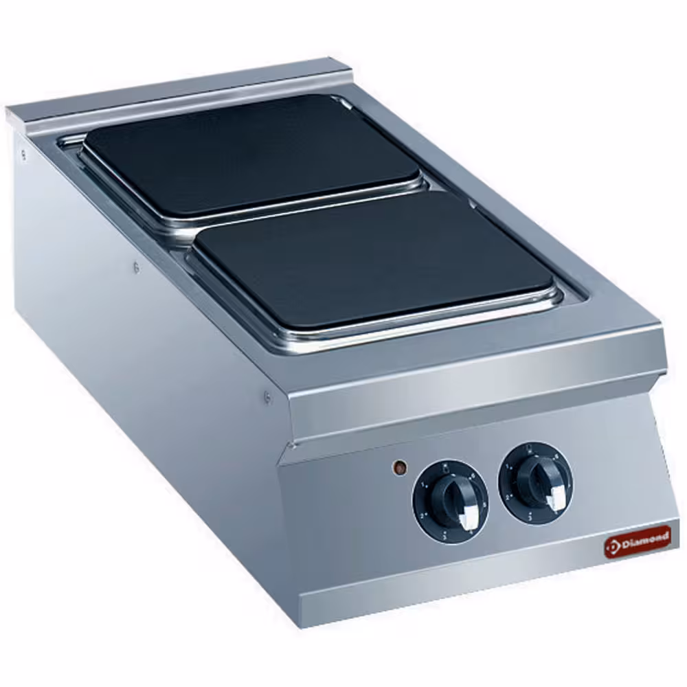 Plaques carrées en fonte, 300×300 mm, bord d’étanchéité en acier inox. Régulation par commutateur à 7 positions.