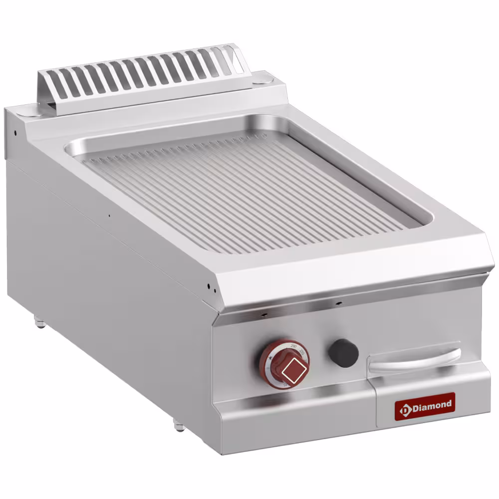 Plaque de cuisson en fonte (15 mm) à haute conductibilité thermique, entièrement soudée au top, inclinée en avant. Un tiroir de récupération du jus de cuisson est positionné sur la façade avant de l’appareil.