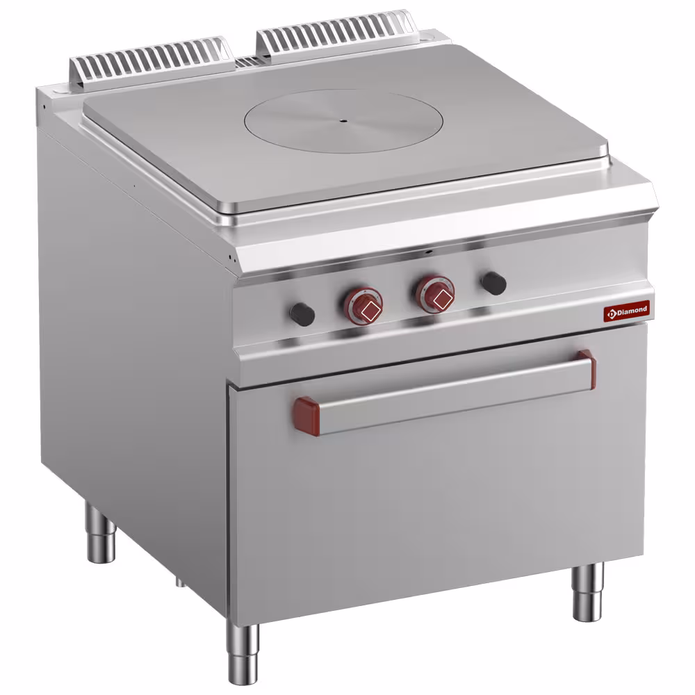 Plaque coup de feu en fonte (10 mm) à haute conductibilité thermique, anneau central amovible, chauffage à gaz par brûleur en fonte positionné au centre de la chambre de combustion, isolation en céramique. Régulation par une vanne de gaz (+/- 500°C), allumage par piézoélectrique et sécurité par thermocouple, accessibilité frontale permettant une maintenance très aisée.