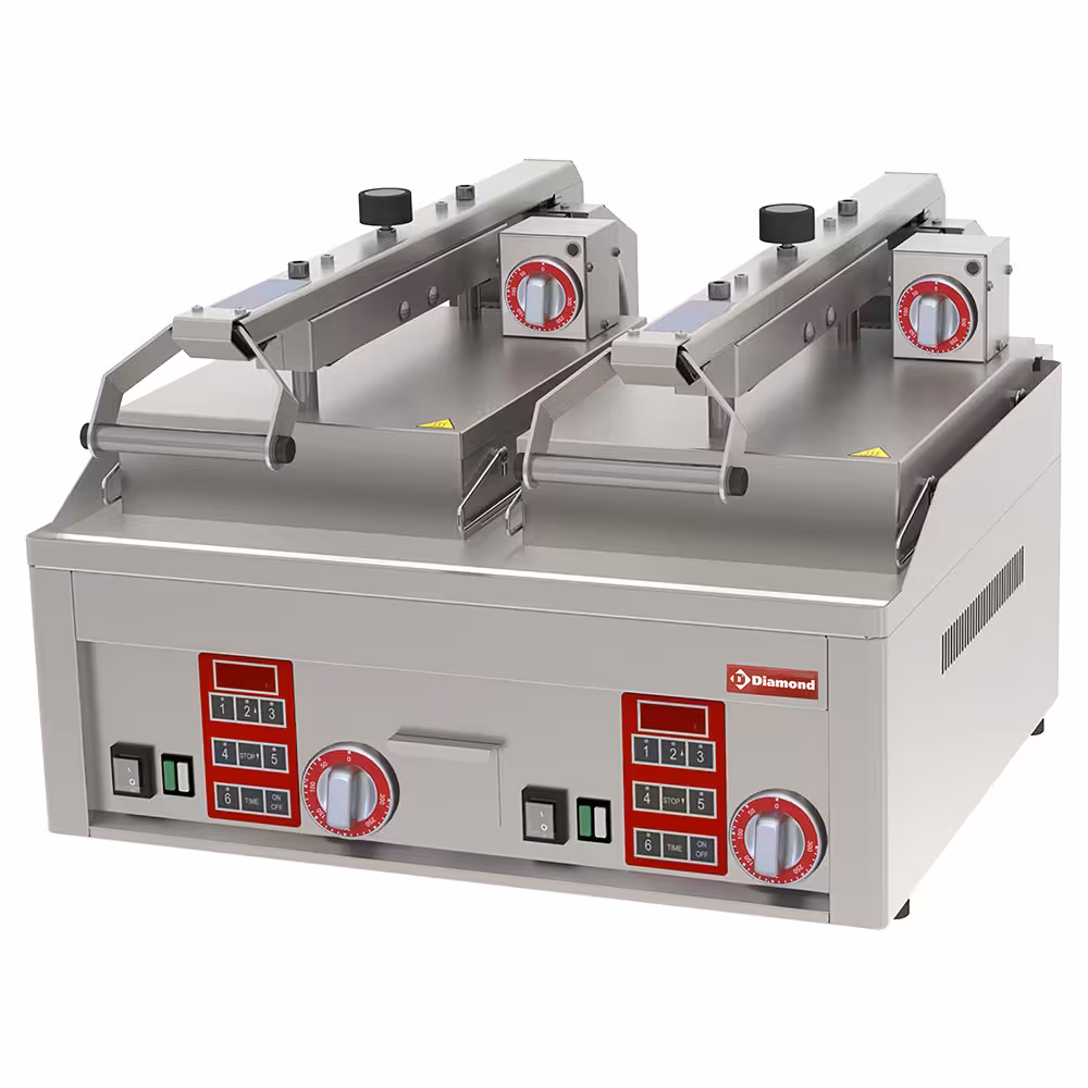 Plaque de cuisson supérieure en téflon antiadhésive (amovible) de dimension 320 x 380 mm, régulation par thermostat(s) de 0 à 300 °C.