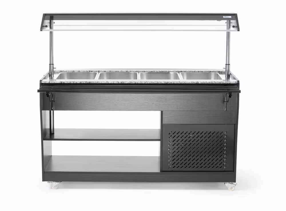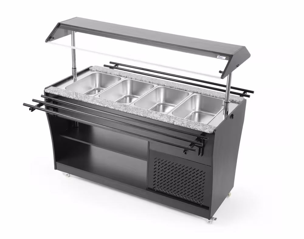Le buffet à salades Arktic peut accueillir 4 bacs GN 1/1, qui sont inclus dans le set. Le buffet est équipé d’un éclairage dans l’auvent, dispose de 2 étagères en dessous pour ranger les assiettes et les couverts et est facile à déplacer grâce à ses 4 roulettes. Ce buffet est la solution idéale pour les établissements en libre-service ou les événements, car il dispose d’une étagère pour les plateaux des deux côtés et assure une parfaite conservation des aliments au frais.