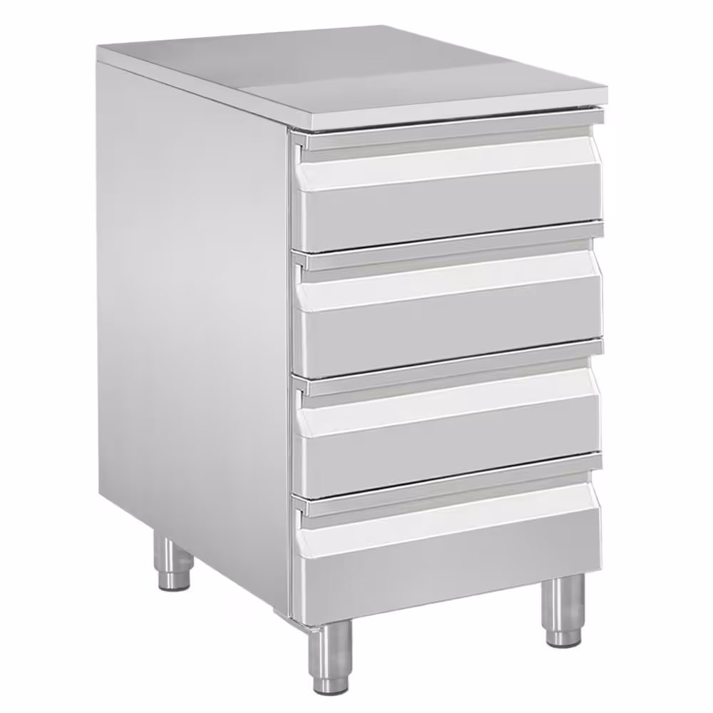 4 tiroirs neutres sur glissières télescopiques (capacité 4x 2 bacs 600×400 = total 8), hauteur maximale des bacs (70 mm).