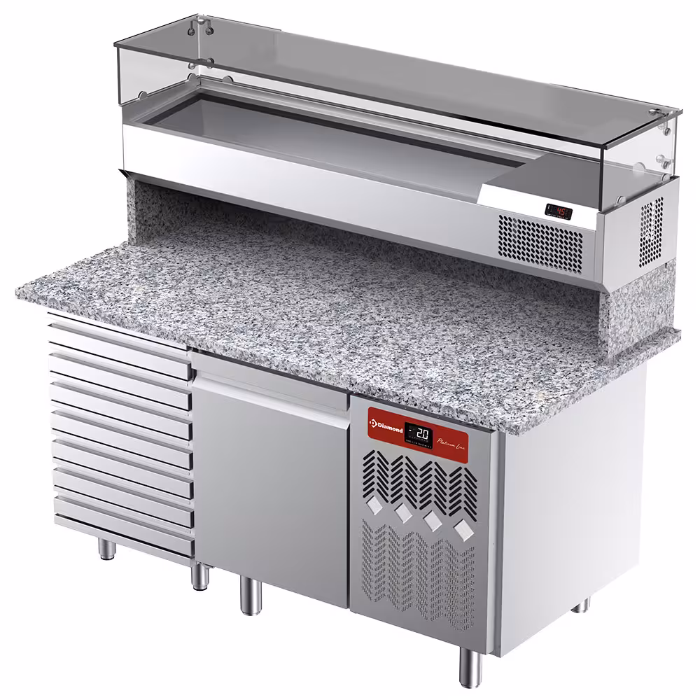 Table frigorifique, ventilée, pour pizza 1 porte et 7 tiroirs avec vitrine réfrigérée 1600x380x410 et plan de travail en granit