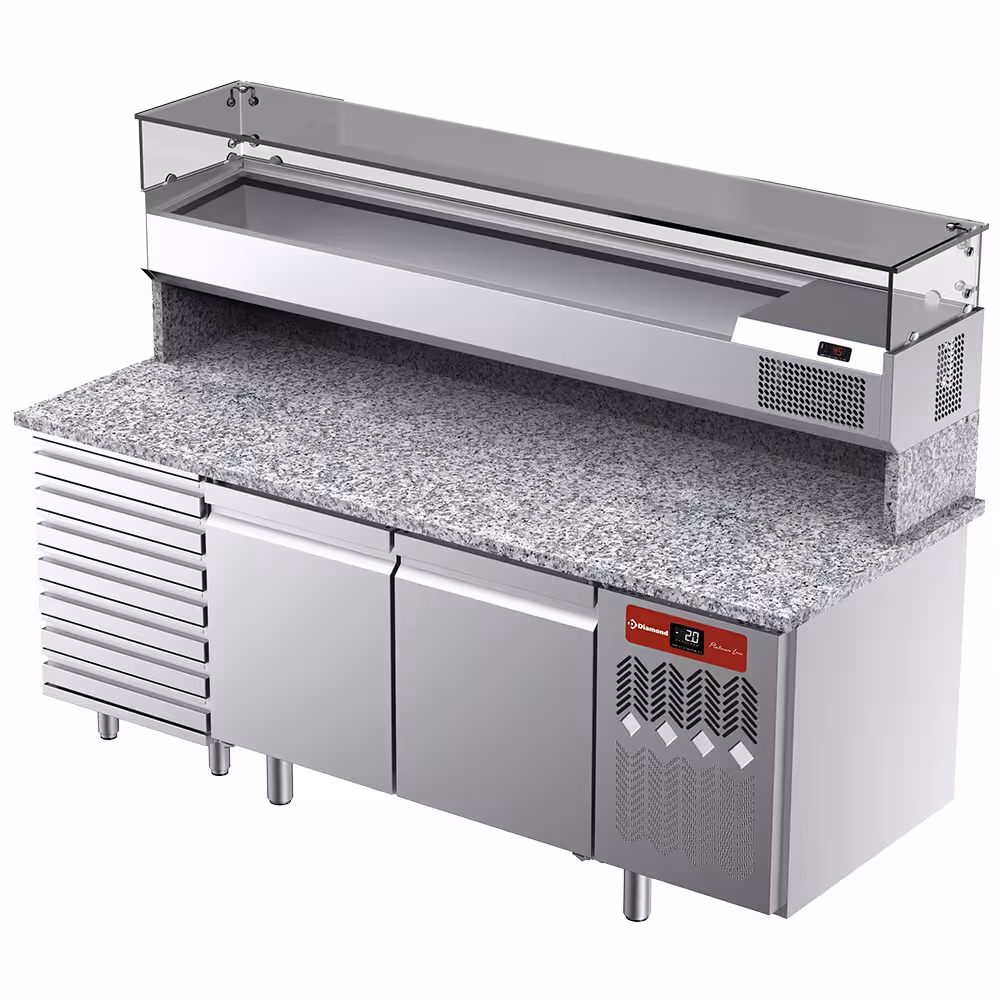 Table frigorifique, ventilée, pour pizza 2 portes et 7 tiroirs avec vitrine réfrigérée 2000x380x410 et plan de travail en granit