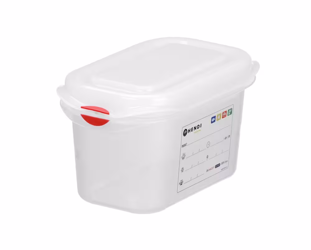 Le bac en polypropylène GN 1/9 HENDI est durable et empilable avec un couvercle sécurisé et résistant aux fuites. Il comprend des clips de couleur, des étiquettes intégrées pour faciliter le suivi et résiste aux odeurs.
