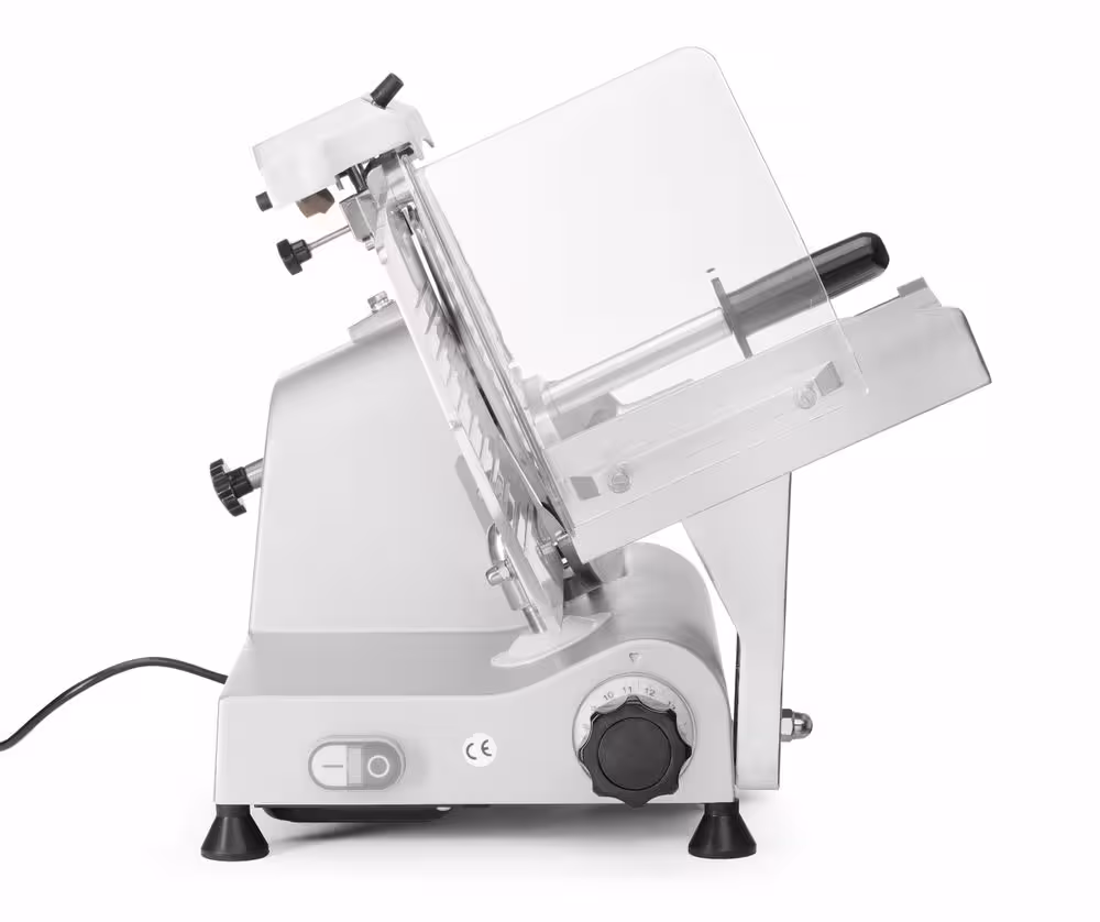 Conçu en aluminium anodisé. Moteur avec ventilation à air de 0,3 CV protégé par un couvercle en plastique. Chariot avec une protection de sécurité en plastique. Facile à démonter pour le nettoyage. Protecteur de lame et affûteur intégré. Modèle incliné avec lame de haute qualité. Diamètre de la lame: 300 mm Diamètre maximal approximatif du produit à trancher: 220 mm Épaisseur de tranche réglable en continu de 0 à 13 mm Mécanisme de verrouillage bloque la lame quand le protecteur de lame est enlevé. 4 pieds antidérapants en plastique. Poids: 24,5 kg.