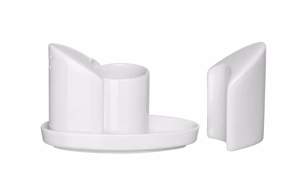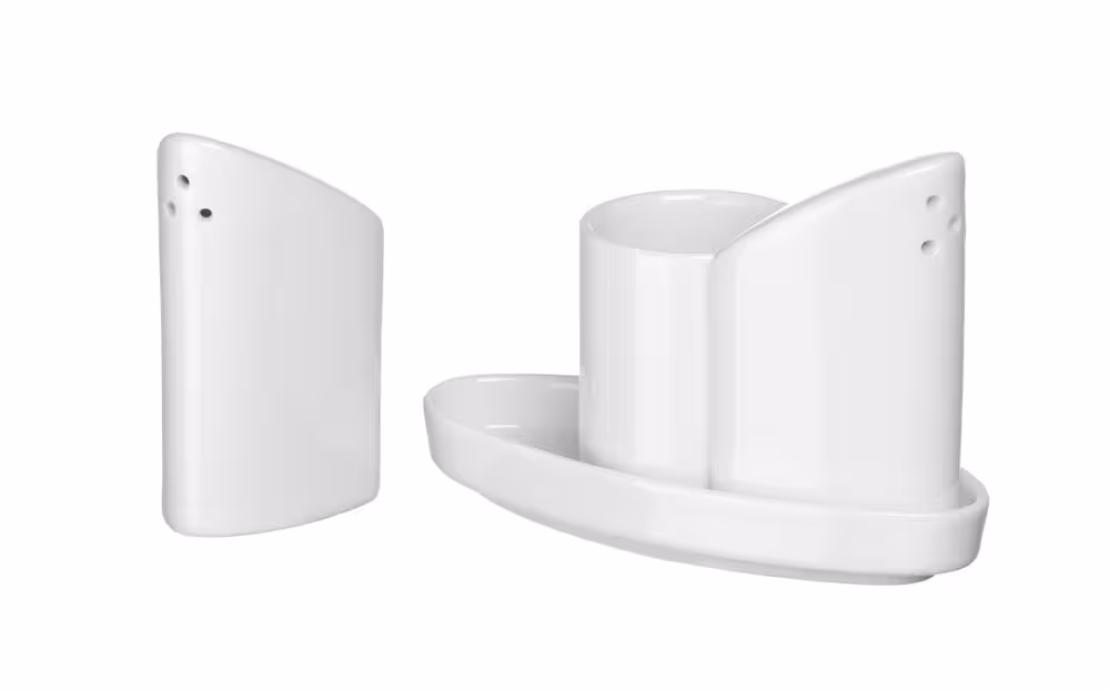 Set de 4 pièces comprenant une salière, une poivrière, un support pour cure-dents et un plateau, le tout en porcelaine.