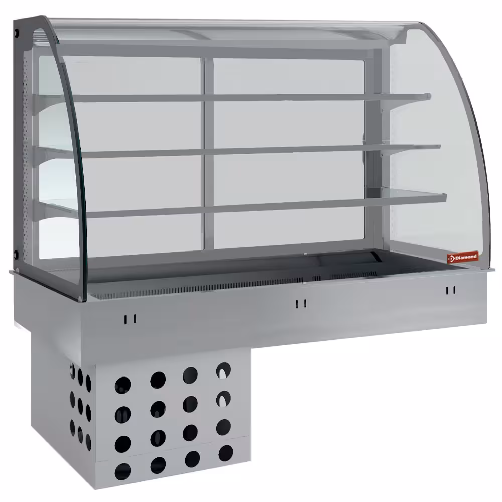 Vitrine à 3 niveaux, portes coulissantes côté service.